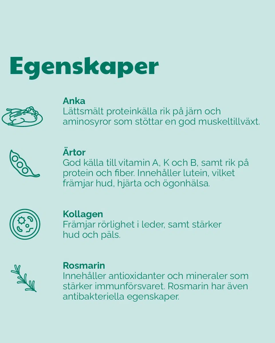 INGREDIENSER- Anka 30%, gula ärtor, flytande grönsaksstärkelse, hydrolyserat kycklingprotein, kollagen, kycklingleversås 5%, torkat rosmarin 1% och laxolja.