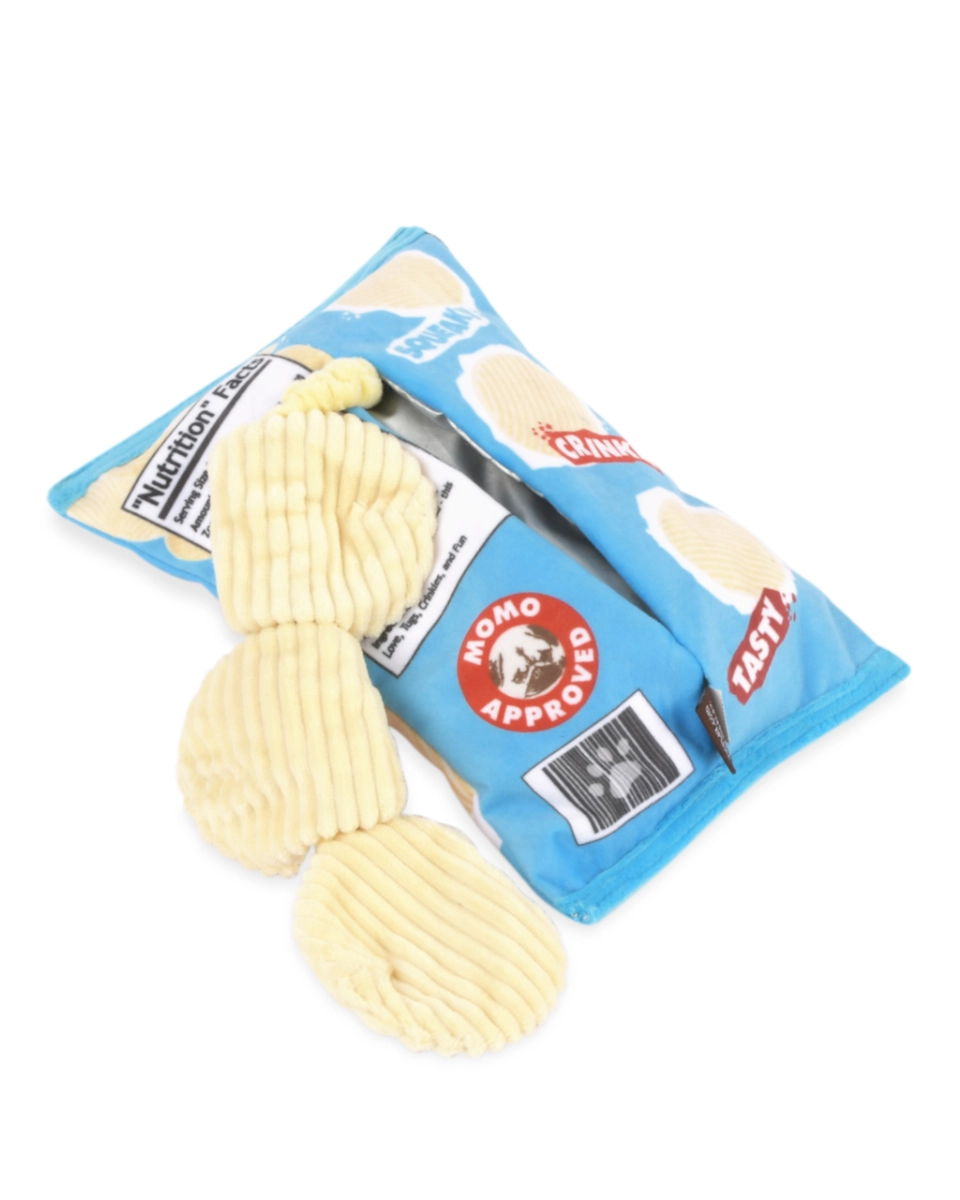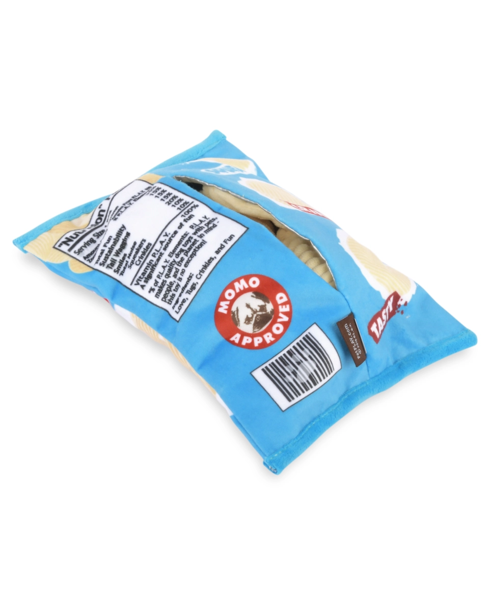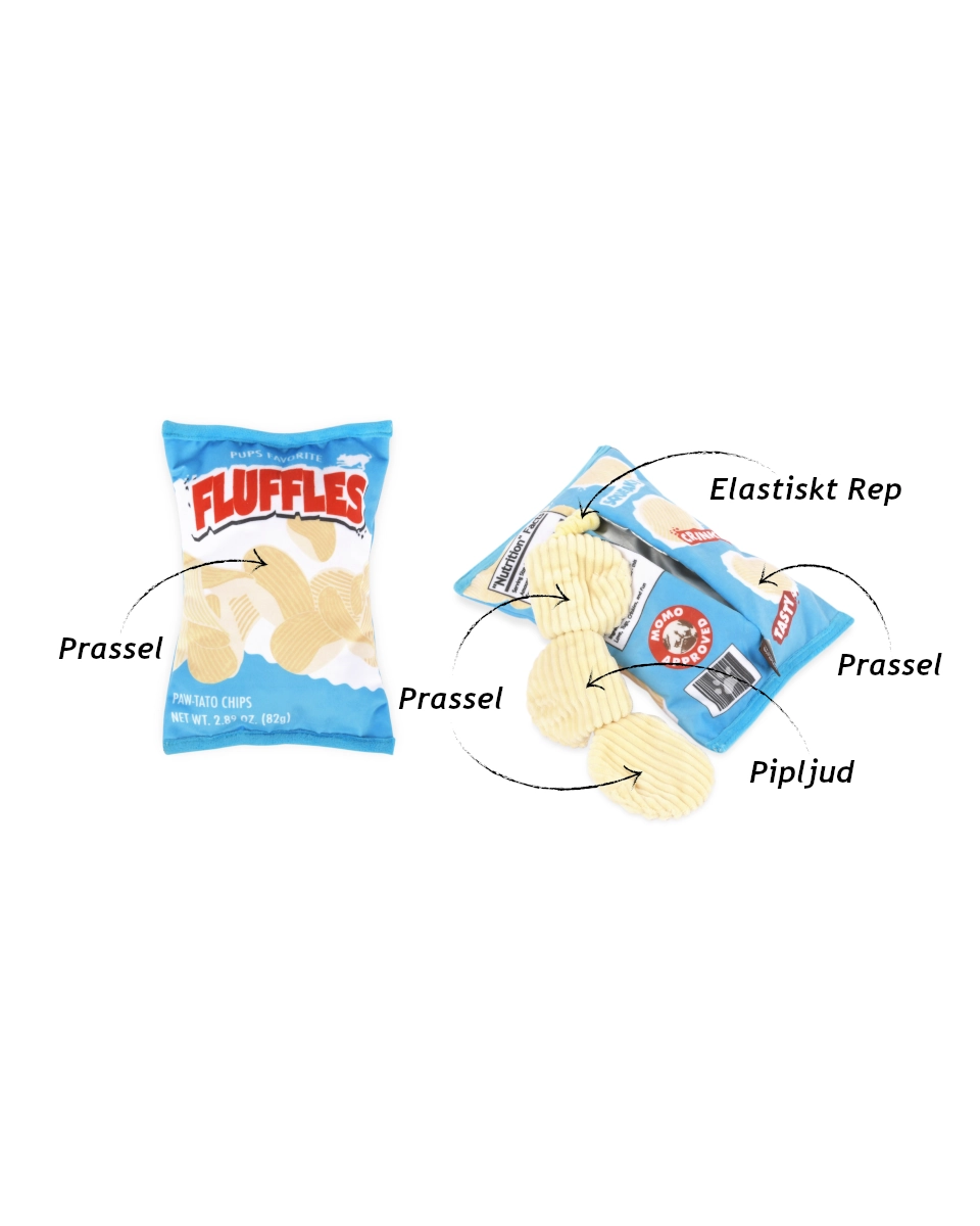 Chips med 100% glädje och inga kalorier. Själva påsen är lika prasslig som en vanlig chipspåse, i påsen finns tre prototyper av chips på ett rep som också prasslar. Din hund kommer älska denna chipspåse och stimuleras om den gillar prassliga leksaker.